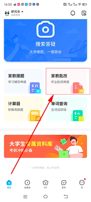 1、打开作业帮app,进入首页,点击打开“家教批改”