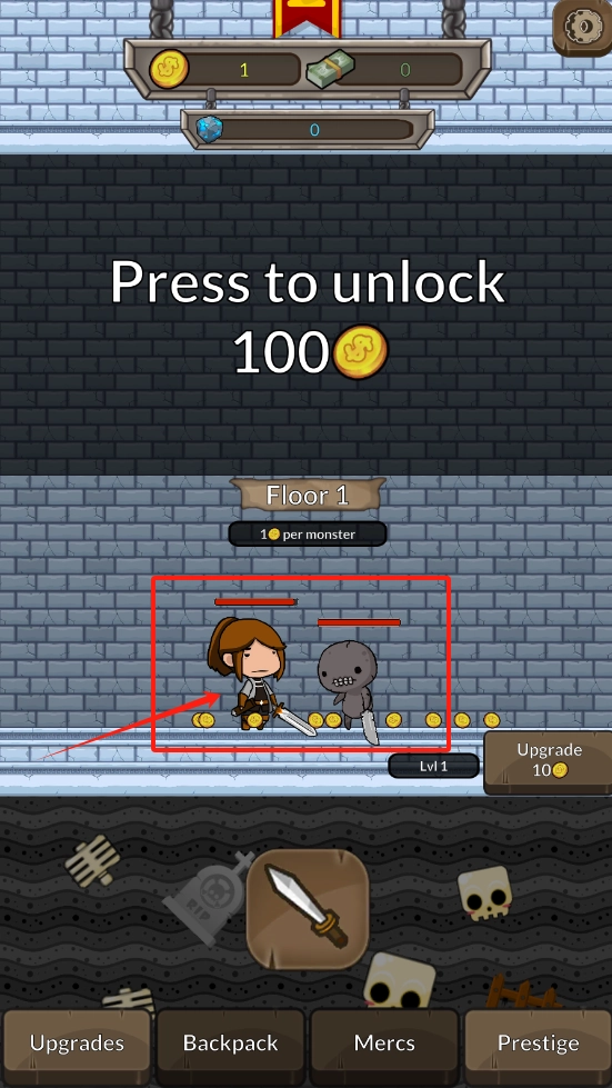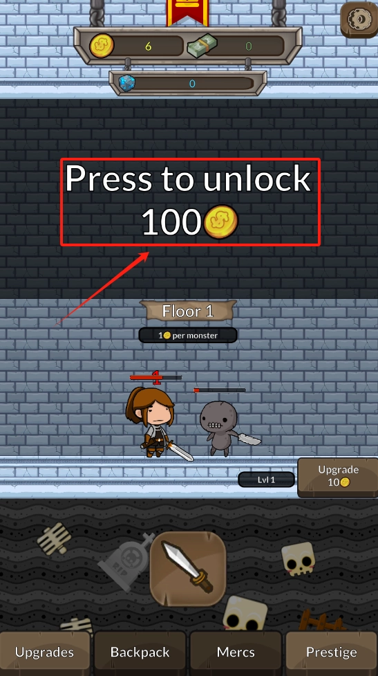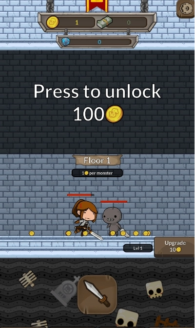 2、通过击杀小怪来赚取金币,当攒够100点“Press to unlock”后,下方有可升级的装备,升级需花费10金币。