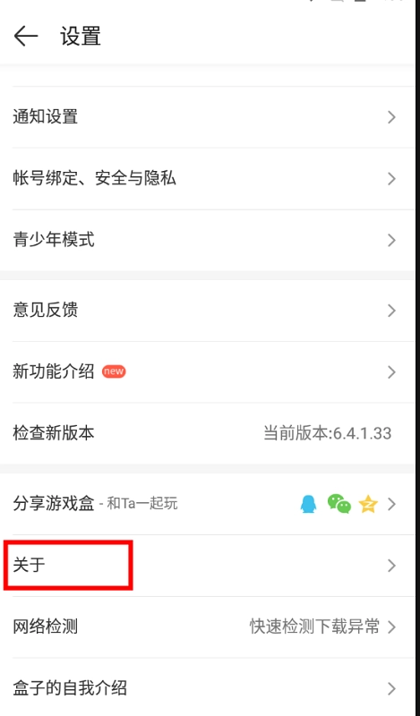 2. 点开设置界面,选中“关于”选项,就能找到4399游戏盒子客服的联系方式。