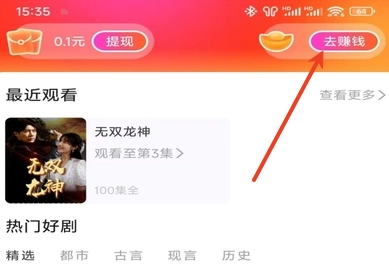2、在短剧的最上方可以找到“赚钱”,用户可以点击进入。