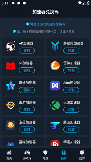 3、于福利界面能够免费领取雷神、炽焰、野豹、AK等加速器的VIP会员。