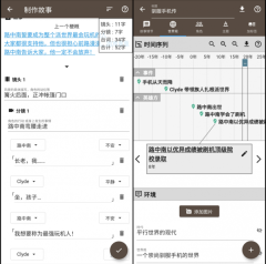 在故事情节页面,已填充好你刚刚选择的内容,每项内容都有更详尽的描述。对于舞台剧或小剧本,在此还能完善分镜与台词。一个故事必然要有世界观和人物关系,因此需切换故事情节页面上方的不同标签,来描述世界观、角色的背景故事、创作出发点,乃至你独特的想法等。