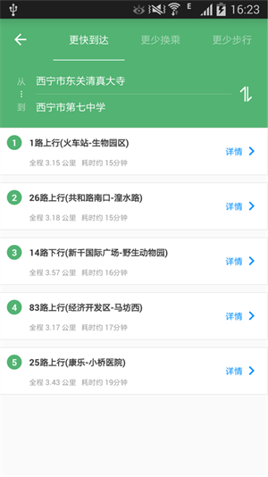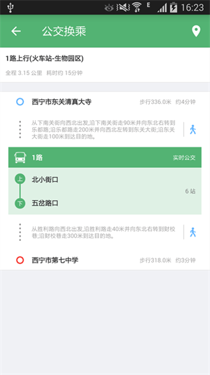 公交出行:在app中输入乘车地点与出行目的地后,它便会给出相应的乘车路线。