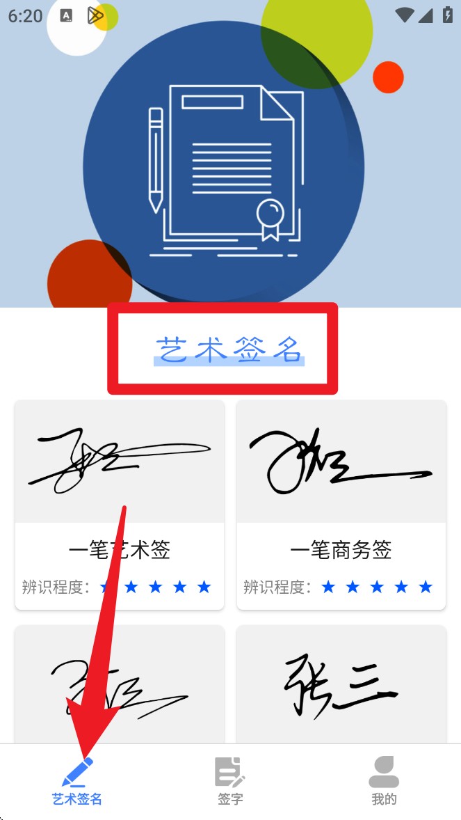 1. 点击底部菜单中的“艺术签名”,进入后能够浏览各式各样的签名字体模板,挑选风格并生成相应样式。