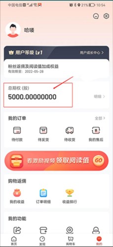 7、打开赞友商城,在“我的”页面,查看到账的期权(股)。