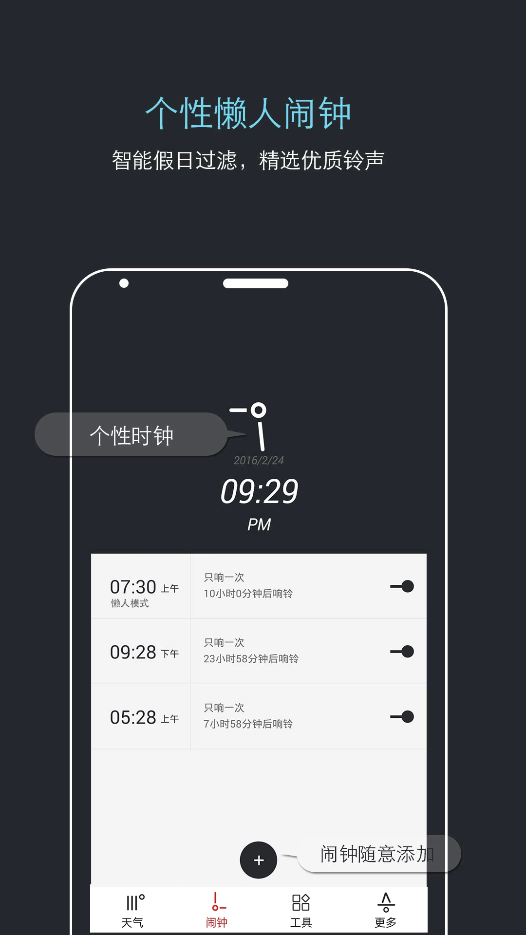 操作便捷,准时提醒。个性化的懒人模式,智能过滤节假日,是起床困难户的福音