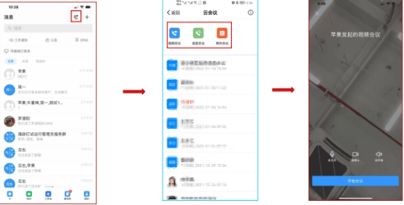 入口一:消息界面点击视频电话图标,选择[视频会议]或[语音会议]进入会议,点击[开始会议],从通讯录选择参会人员,点击确认即可发起视频会议/语音会议。