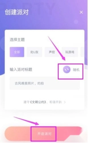 3、随后用户能够挑选派对主题并填写派对标题,再点击“开启派对”按钮。