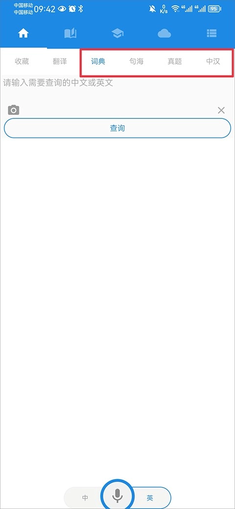 4、除了支持中文与英文之间的翻译,你还能借助软件查询中文和英文的词语、句子、真题,以及中汉相关内容等。
