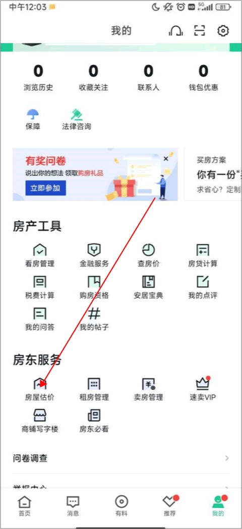 1、首先需要用户打开安居客,进入到主页面,点击我的,找到房东服务中的房屋估价,这边还包括了租房管理,买房管理,速卖vip,商铺写字楼和房东必看功能。2、在房屋估价的功能页面,用户需填写相关房屋信息,随后点击下方的估价功能选项。