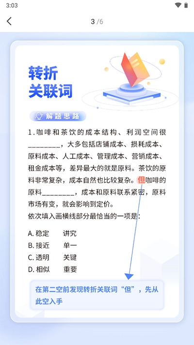 4、若选择继续学习,学生将进入关卡2的知识锦囊板块。该板块包含真题展示、解题思路解析以及关键词拓展等内容,能让学生快速清晰地掌握相关知识。