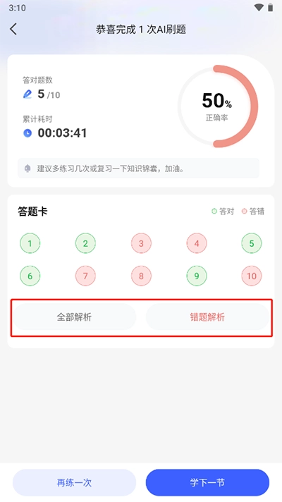 6、学生完成AI题串练习后,能够查看练习结果,其中答对题数、累计耗时、正确率等信息都清晰可见;同时还可以选择查看所有题目的解析,或者仅查看错题的解析。