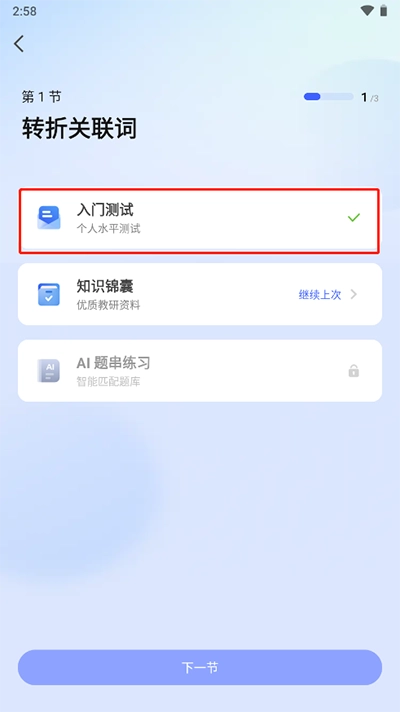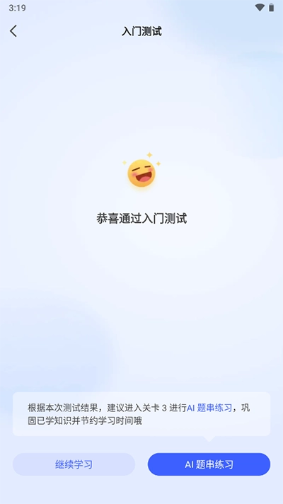 3、软件会根据本次的测试结果来判断是继续学习还是直接进入关卡3进行AI题串练习;