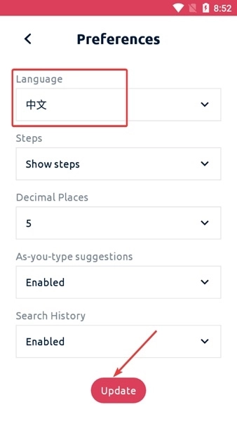 3、把language设置为中文,最后点击下方的update按钮就可以了