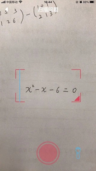 3、启动手机摄像头,把题目放到屏幕提示的区域里,然后点击下方的红色按钮