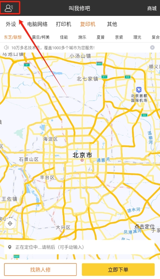 1、打开叫我修吧 ,进入软件主页面,在左上角找到小人头像标识,果断点击它 。