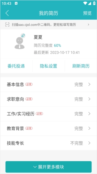 2、在“我的简历”中可以对自己的一系列特长以及自己的求职意愿进行填写。