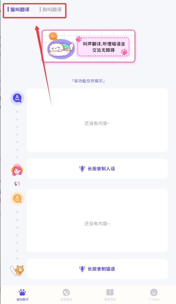 1、进入首页,选择宠物种类可以选择翻译,点击录音录入话即可。