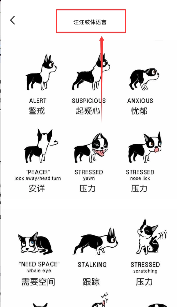 3、进入汪汪肢体语言,往下翻阅,即可了解宠物时刻的动作答案。