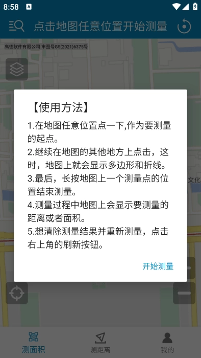 3.测量过程中地图上会显示要测量的距离或者面积。