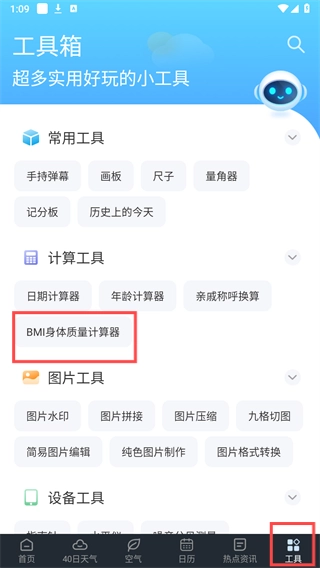 1、访问右下角的【工具】界面,点击其中的【BMI身体质量计算器】功能