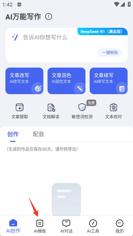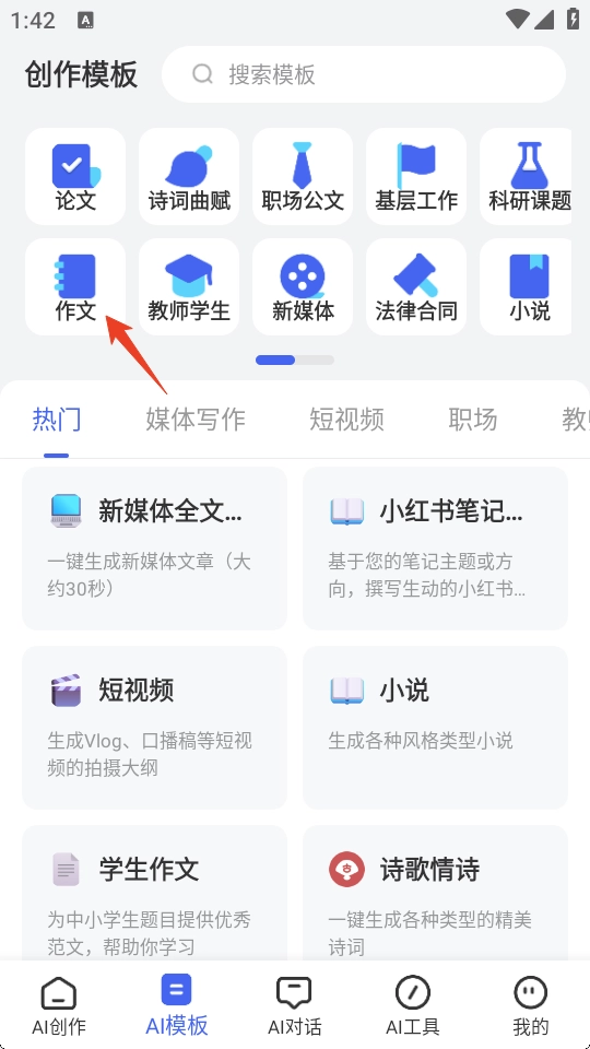 1、打开AI万能写作,点击下方【AI模板】