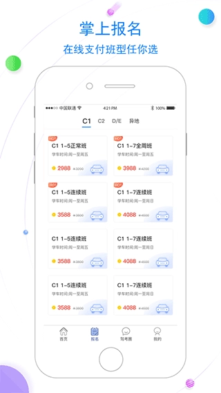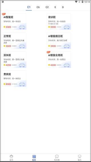 2、打开软件后,点击“报名”选项,接着选择你要报考的车型以及班级类型。