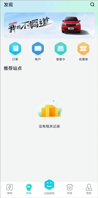 2、进入发现页面,能够查看换电订单以及个人账户信息。