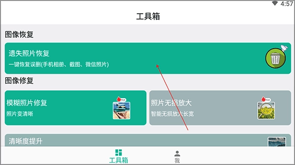 1、先把手机照片修复软件安装好,接着打开工具箱,找到并点击遗失照片恢复功能。