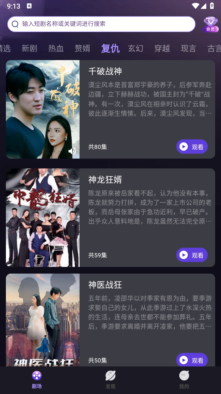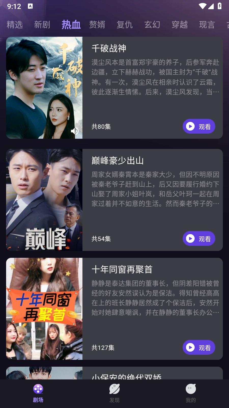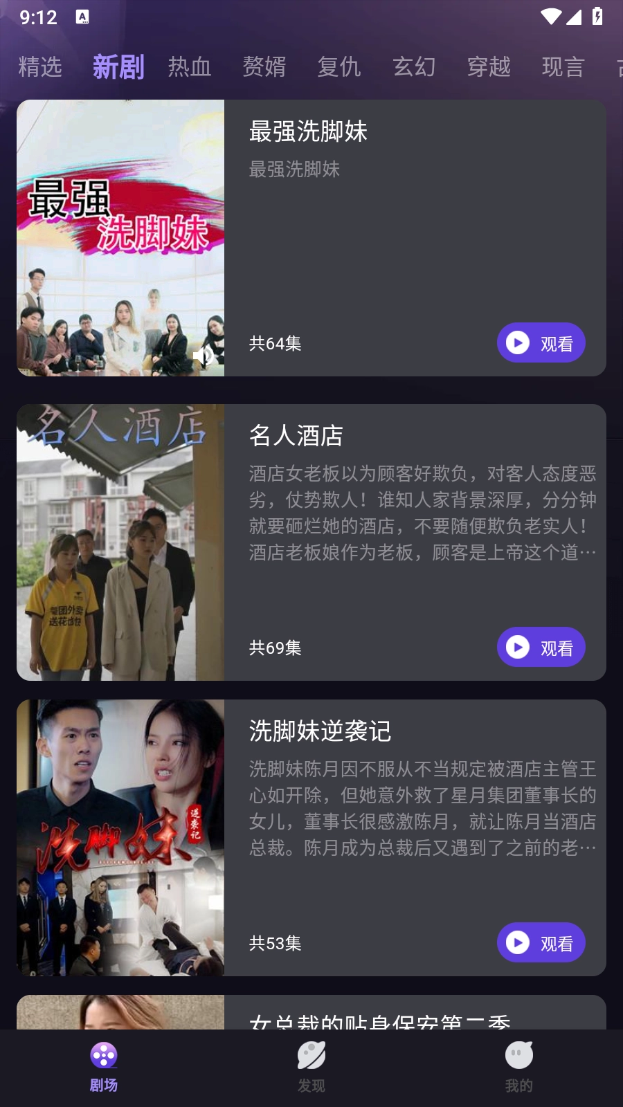 2.在剧场页面的顶部区域,能看到种类丰富的短剧分类,像新剧、热血、赘婿这类都包含在内。