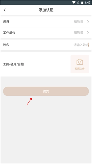 3、按照界面提示选择对应项目与工作单位,填写姓名信息,上传工牌照片,完成后点击“提交”按钮,待系统审核通过,即可完成认证流程。