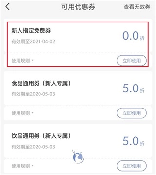 2、进入“我的”页面,找到“优惠券”选项并打开,查看新人专属的免费券,然后点击“立即使用”按钮。