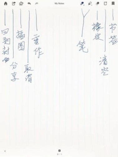 2、双击笔记就能新建一个空白页面。像上图展示的那样,顶部功能栏从左到右依次是:返回封面、分享、撤销与重做、画笔、马克笔、橡皮擦、清除页面和设置标签。