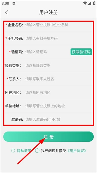 4、填写企业名称、手机号码等相关信息,勾选对应的协议条款后,点击注册按钮,即可完成注册流程。