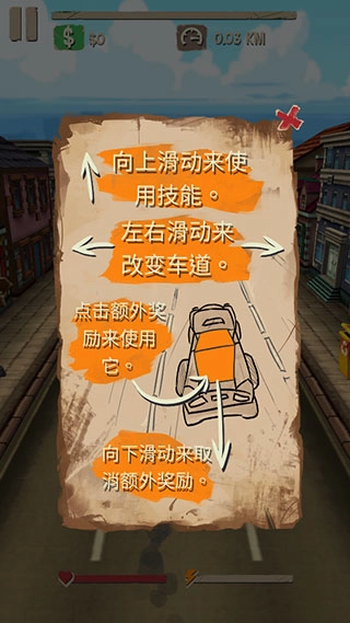 3、进入到游戏内通过左右滑动控制改变车道,上滑使用技能