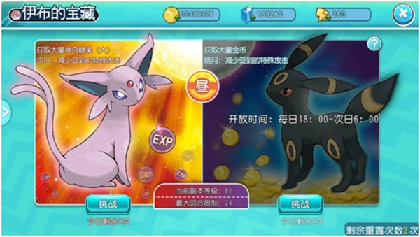 伊布的宝藏分为太阳和月亮,前者拥有高防御能力并掉落精灵经验道具,后者拥有高特防能力并掉落大量金币。每天有固定的时间段,挑战即可获得大量资源奖励。玩家达到35、40、50等级别时,副本难度相应提升,奖励也会变得更加丰厚
