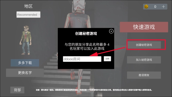 5、点击“创建秘密游戏”然后就可以创建多人游戏房间,其中可支持玩家与朋友们分享此名称房间号最多四名玩家加入游戏。