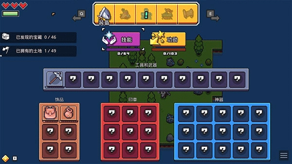 点击菜单栏中的“装备”按钮,可打开装备界面,此处将展示已经解锁的工具、武器、饰品、印章及神器