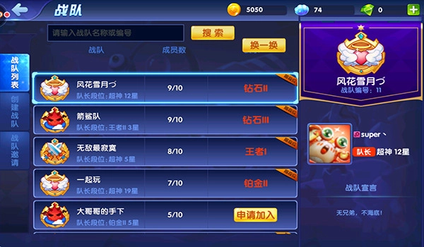 2、战队页面展示目前存在的几个战队的图标、名字、人数、队长段位等等信息。有可以加入的战队会显示申请加入按钮,点击即可。队长接到申请会选择是否接纳你入队。