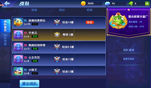 3、入队之后就可以看到战队的具体信息。在线的队友会有在线提示,每个队友的段位和等级也能直接看到,点击名字能看到更多信息。如果不想加入已经存在的战队,也可以自己创建一个战队。在创建战队标签,可以定制战队名称和战队宣言,选择战队图标。但创建战队需要花费100绿钻或200彩贝。其实这个价格不算贵,各种活动送的绿钻和彩贝攒够这个数目真的不难。