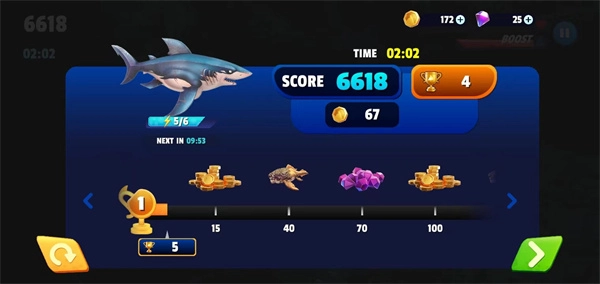 5、可以收集不同的鲨鱼并组成自己的强大鲨鱼队伍,给游戏带来更加深入的玩法体验。