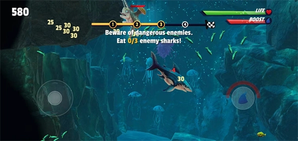 3、丰富的游戏模式和挑战任务,在游戏中吞噬其他鱼类、游泳者和海洋生物,不断升级和进化自己的鲨鱼,让它变得更加强大;