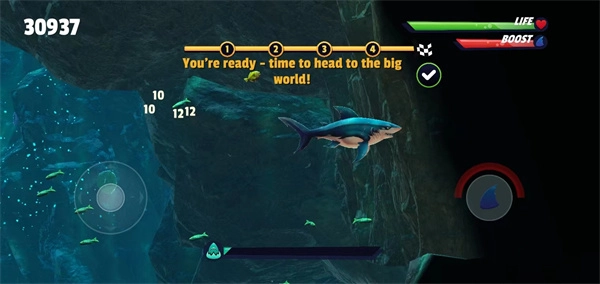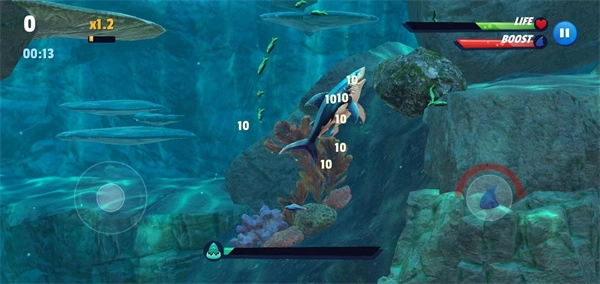 2、首先是熟悉左边的按键,这个按钮是控制鲨鱼移动以及方向,而右边的按键点击后可以加快鲨鱼的移动速度;其次就可以吃小鱼来让自己升级;