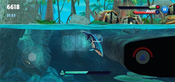 2、除了鲨鱼自身的攻击技能外,还有各种装备和技能可以选择,例如增加跳跃高度、鳍速、远程攻击等等;