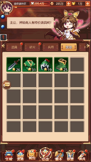 1、【装备】能直接提升武将的【攻击】【生命】属性,可通过【征战】掉落、【铁匠铺】合成等方式获得。