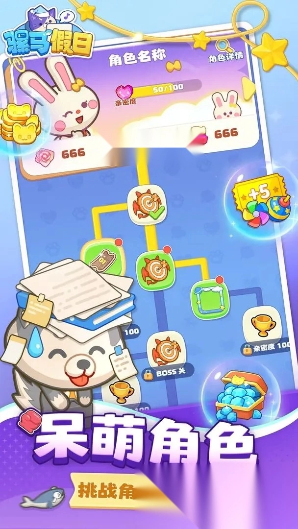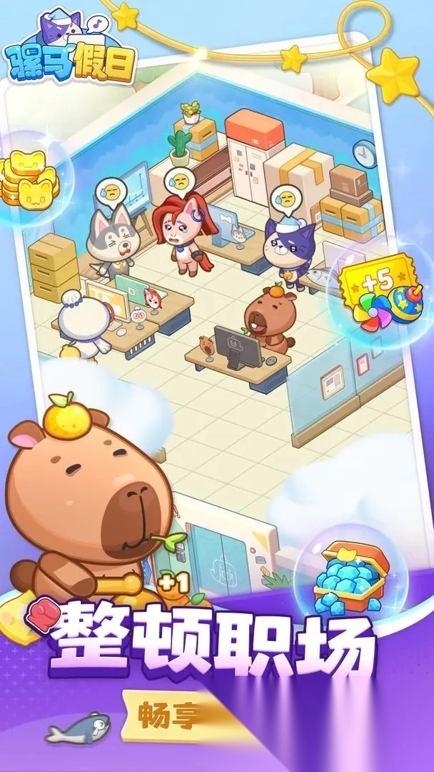 骡马假日是一款休闲益智的消除类闯关游戏,它有着萌萌的卡通画风,以职场为主题背景融入了多样化的相关元素,把经典的三消玩法与任务闯关模式相结合,为玩家打造出一款能放松心情的解压小游戏。玩家可以跟着可爱的小动物,在上班时间尽情摸鱼、吃东西、去度假,摆脱那浓浓的“班味”!