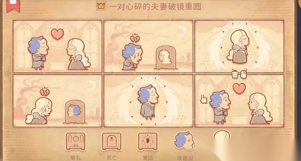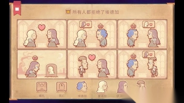 通关诀窍:首先让其他三位角色分别成婚,保证他们都拥有伴侣,接着让埃德加向每个人表达爱意,如此便会全部遭到拒绝。