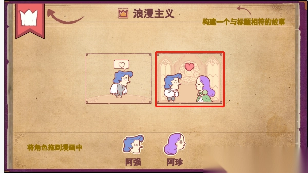 2、在此以第一章为例进行示范,第一章标题为【浪漫主义】,玩家需依据标题、人物以及格子限制,构建一个契合该标题的故事。