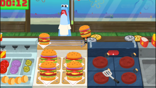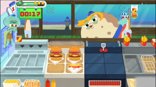 章鱼哥负责配菜和饮料,确保他的工作效率,及时补充食材。