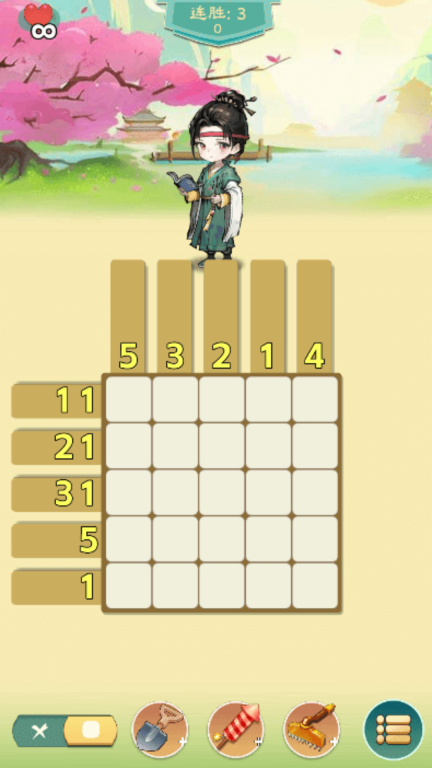 2当在关卡中遇到卡顿情况时,优先处理数字较大的行列。例如,若某一行的数字是5,那么就可以直接把整行涂满颜色,这样能快速确定部分区域,为后续其他行列的推理提供依据。